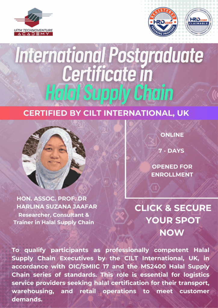 This course highlights the importance of the halal industry, focusing on halal logistics and supply chain management in meeting current market demands. It covers the implementation of halal supply chains through quality assurance systems aligned with certification standards.