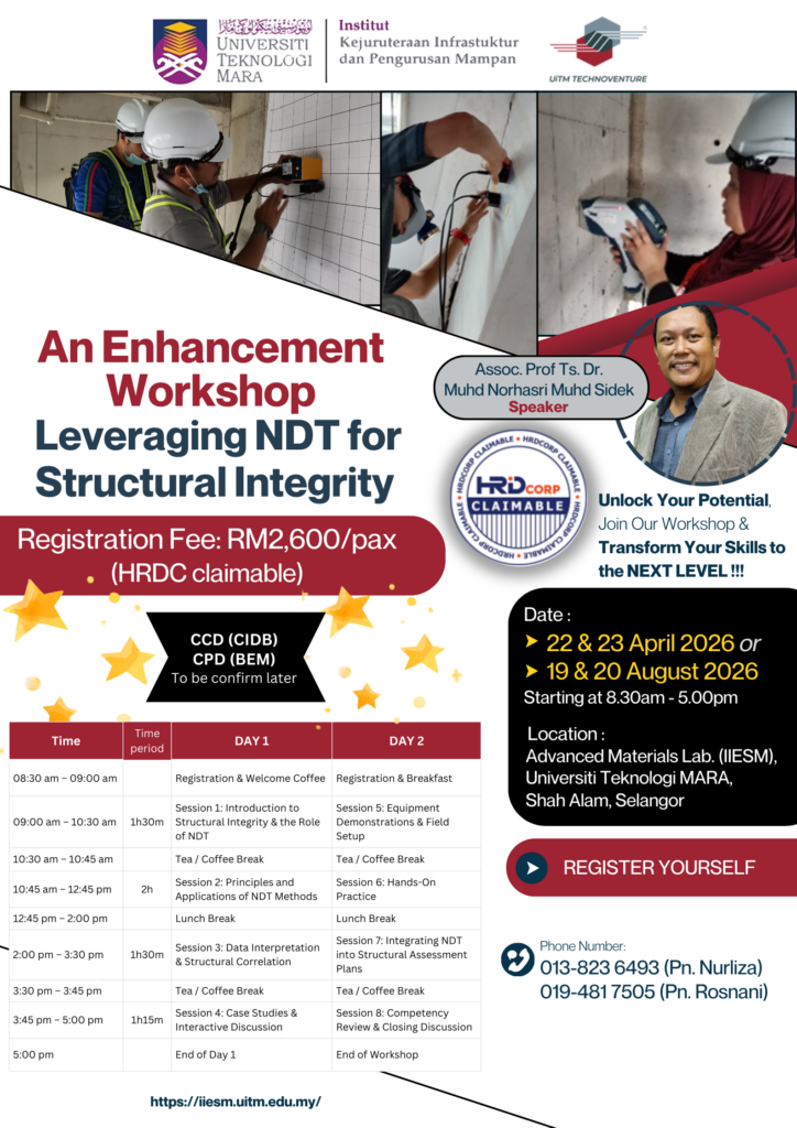 The Enhancement Workshop: Leveraging Non-Destructive Testing (NDT) for Structural Integrity is a two-day intensive professional development programme designed to strengthen participants’ understanding and practical application of NDT techniques in structural assessment. This workshop covers the fundamental principles of structural integrity, key NDT methods, data interpretation, and real-world case studies, followed by hands-on equipment demonstrations and […]